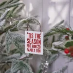 A wooden ornament from our Christmas Collection displaying a fun Christmas inspired sentiment in a box sign style that reads "'Tis The Season For Forced Family Fun." Seasonal ornament features holiday red glitter details on sentiment with coordinating white color on the sides and back. Our Family Fun ornament is easy to hang for display via attached twisted wire hanger. A fun Christmas-themed ornament perfect for seasonal display.