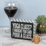 A classic black and white wooden box sign lending a distressed "Yoga Class? I Thought You Said Pour A Glass" sentiment with polka dot patterned trim. Easy to hang or can free-stand alone.